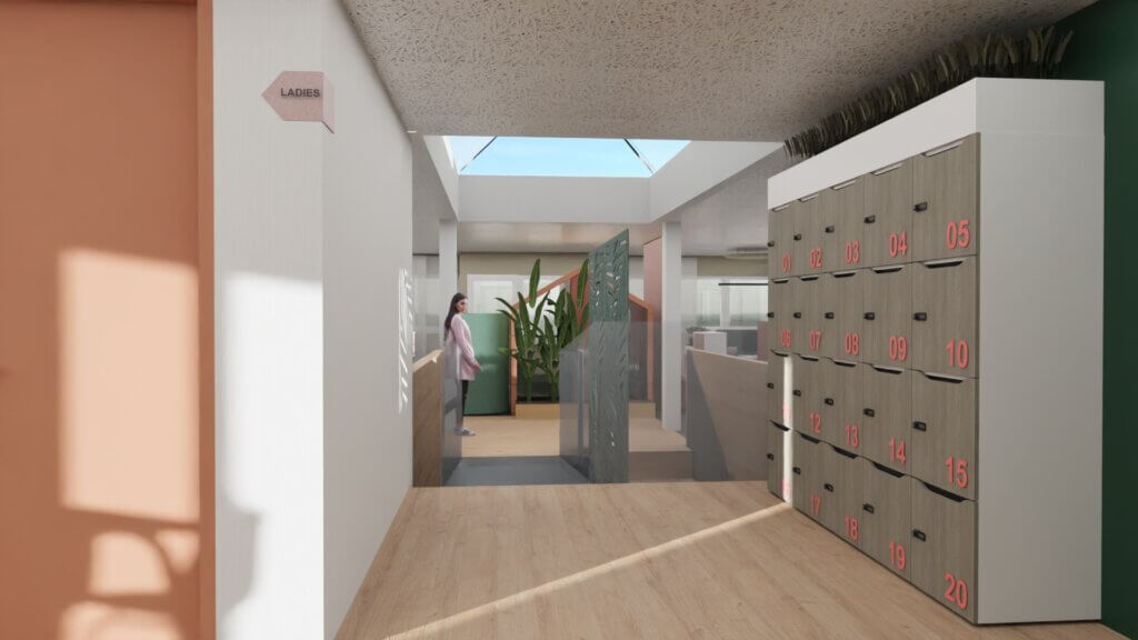 Ein zentrales Element des Konzepts ist ein offenes Bürokonzept. Helle Materialien und verschiedene Farben sorgen für eine freundliche Atmosphäre, in der man sich gerne aufhält. Die Räume wirken bewusst offen und verbindend damit Begegnung, Austausch und Zusammenarbeit ganz selbstverständlich entstehen können.