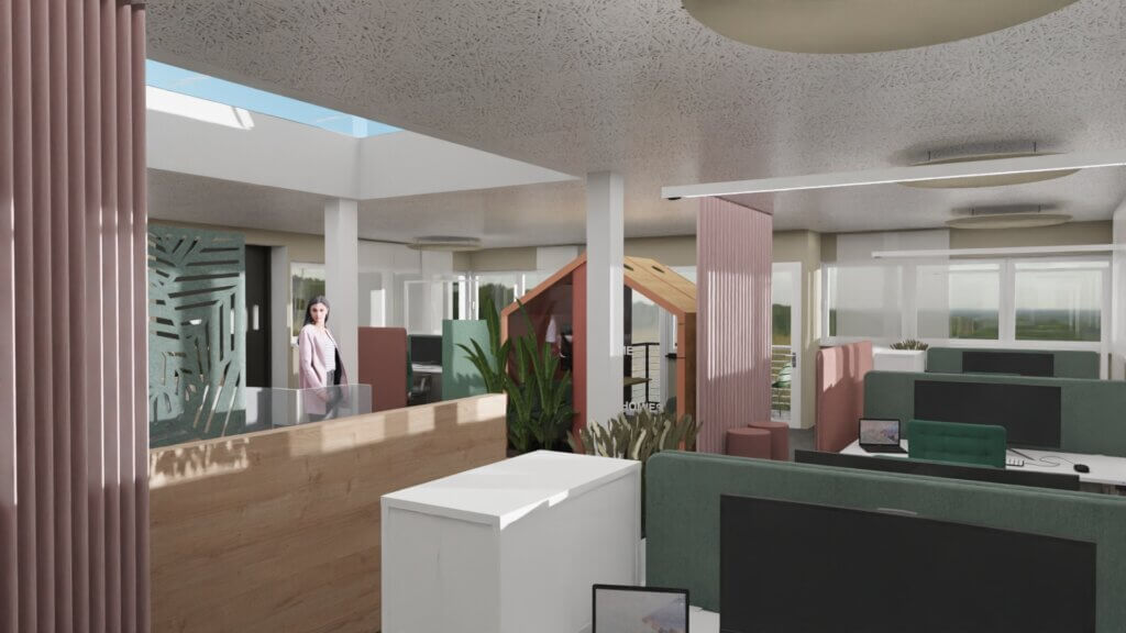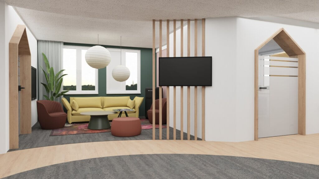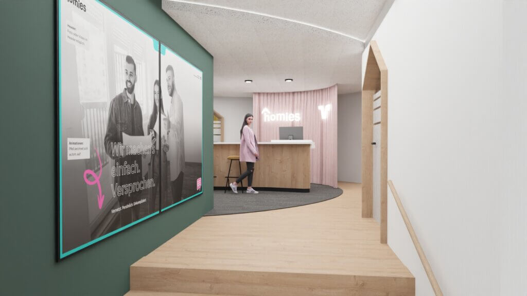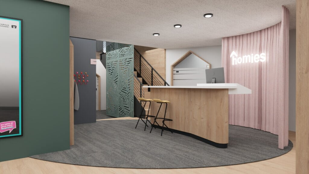 Farben, Formen und Materialien greifen den modernen, sympathischen Charakter der Marke auf. Typische Elemente wie hausförmige Durchgänge oder Raumakzente tauchen an verschiedenen Stellen auf und machen das Gebäude nicht nur funktional, sondern auch erkennbar als Teil unserer Homies-Welt.