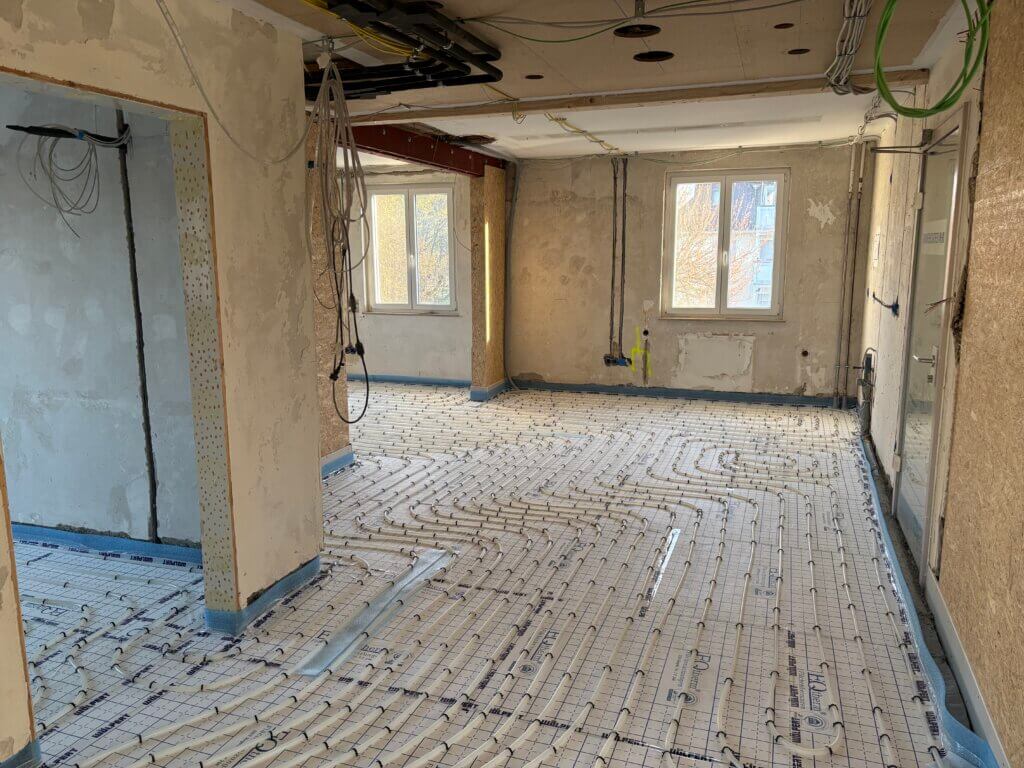 Auch die Fußbodenheizung ist vollständig verlegt. Damit ist alles bereit für den nächsten großen Schritt – den Estrich. Ein gutes Gefühl zu wissen: Hier entsteht nicht nur ein moderner Arbeitsplatz, sondern auch ein Ort, an dem man sich wohlfühlen kann.